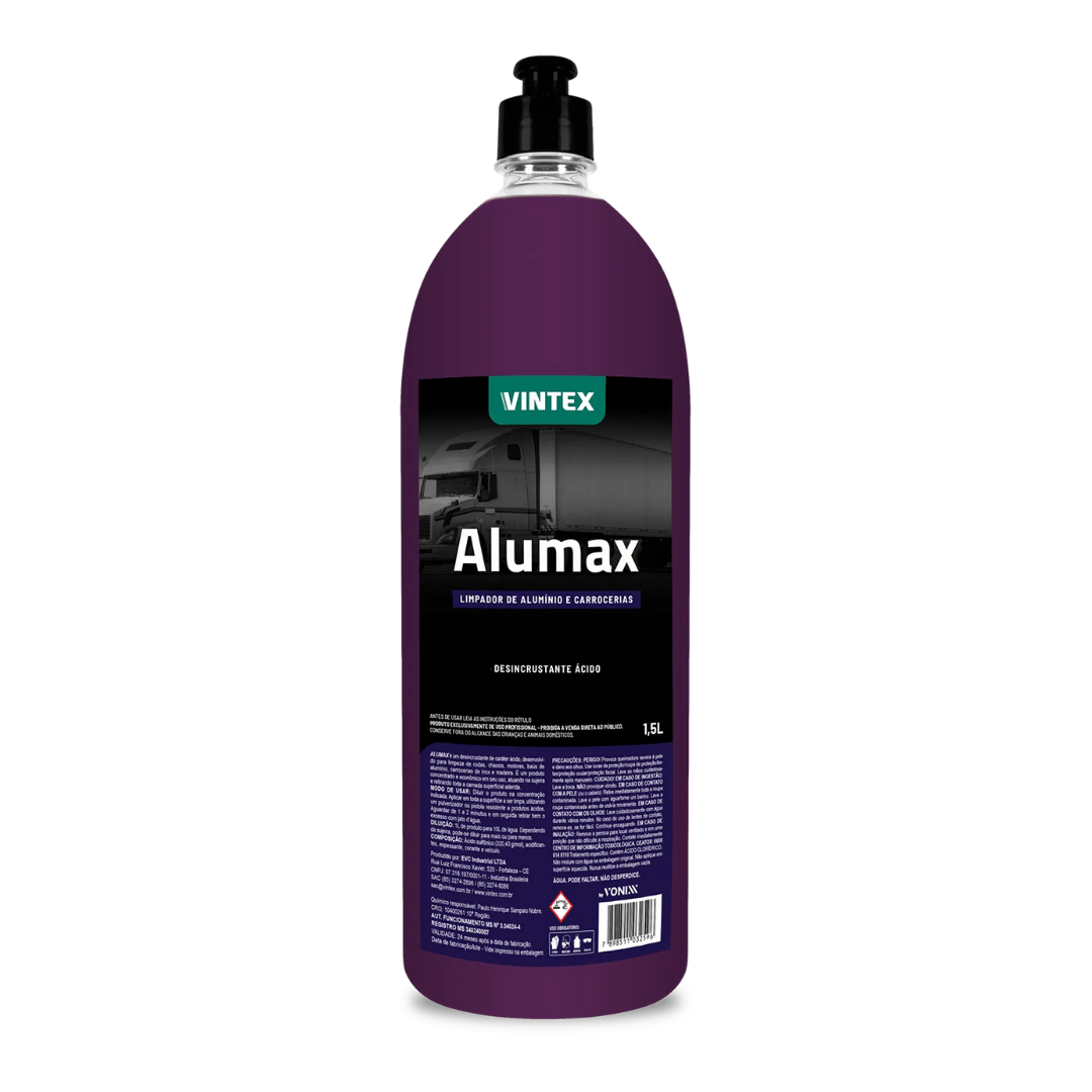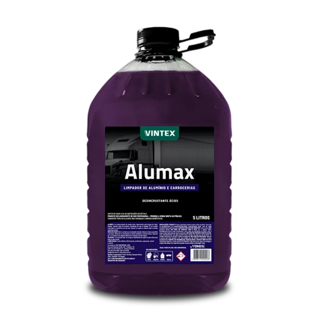 Alumax é um desincrustante de caráter ácido, desenvolvido para limpeza de rodas, chassis, motores, baús de alumínio, carrocerias de inox e madeira. É um produtos concentrado e econômico em seu uso, atuando na sujeira e retirando toda a camada superficial aderida.